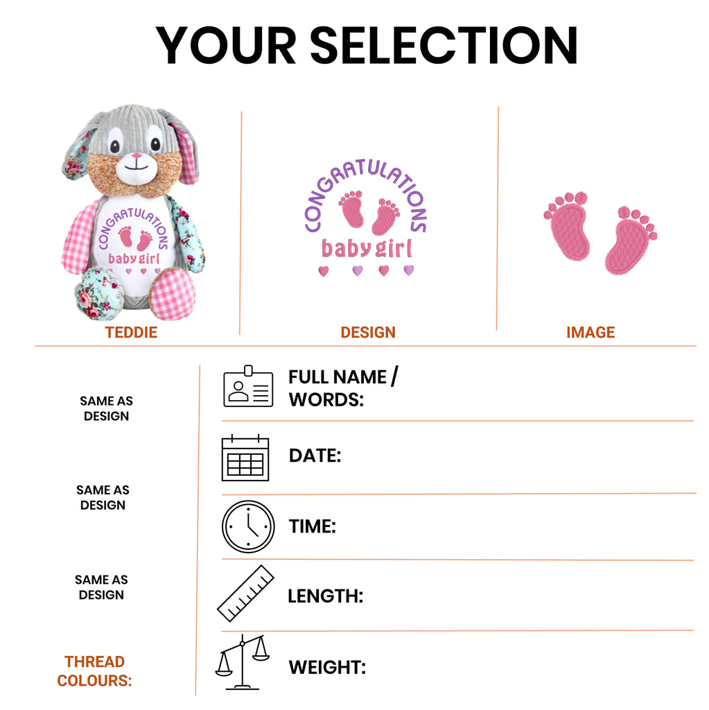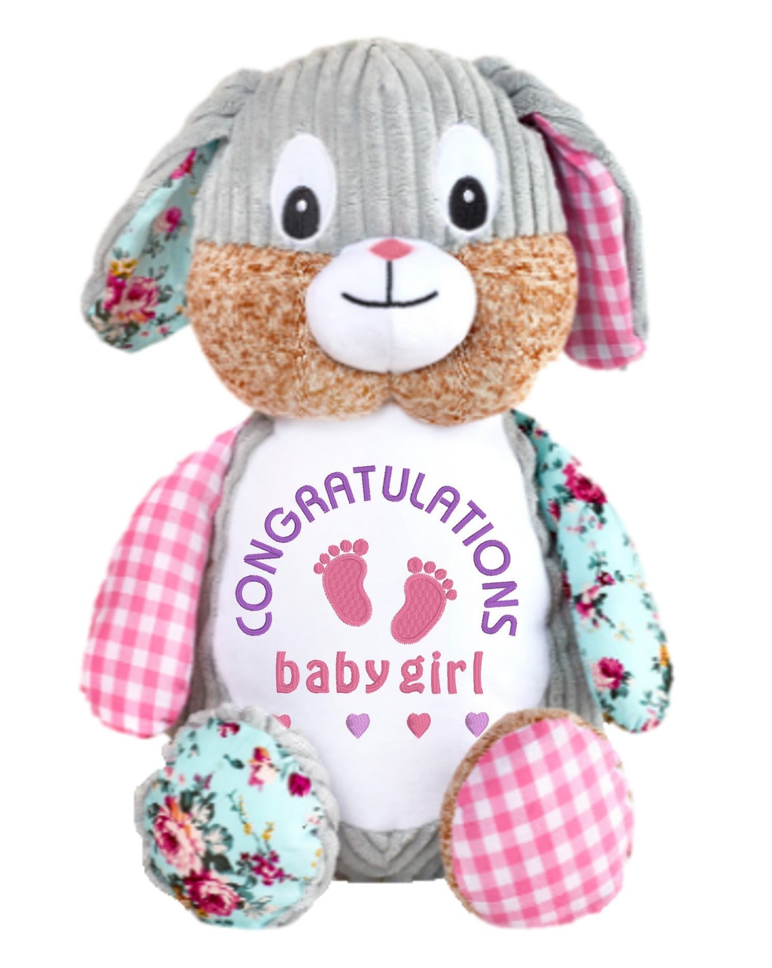 Introducing Pink Floral, the Harlequin Pink Bunny Sensory Clovis Brampton. This custom bunny teddy bear is embroidered with a fully personalised design, allowing you to create a unique keepsake cherished for life. Its corduroy grey body and patterned ears, arms, and feet add a delightful touch of texture and visual appeal. With its soft and machine-washable material, this toy is perfect for babies, and its crunchy crackly ears provide an extra sensory experience. Make playtime truly enchanting with Pink Floral, the personalised bunny teddy bear that captivates both hearts and imaginations.